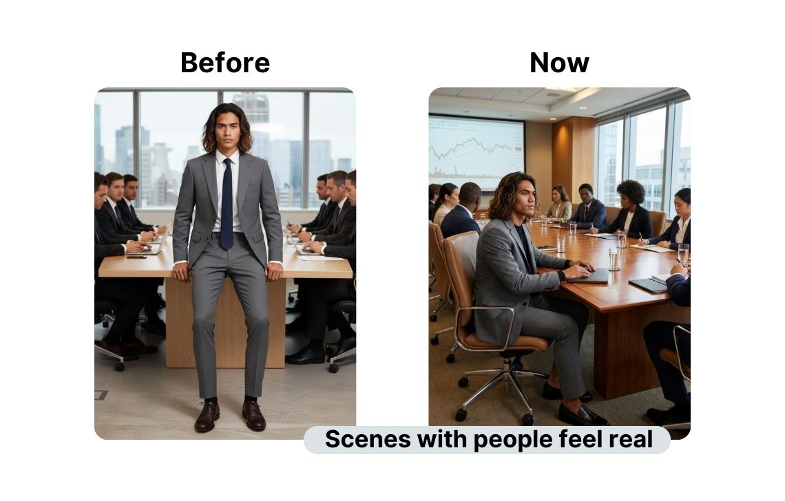 Busy and multi-person environments now feel more coherent: subjects interact more naturally with the setting, proportions are more consistent, and the scene reads as a real moment rather than a staged composite.