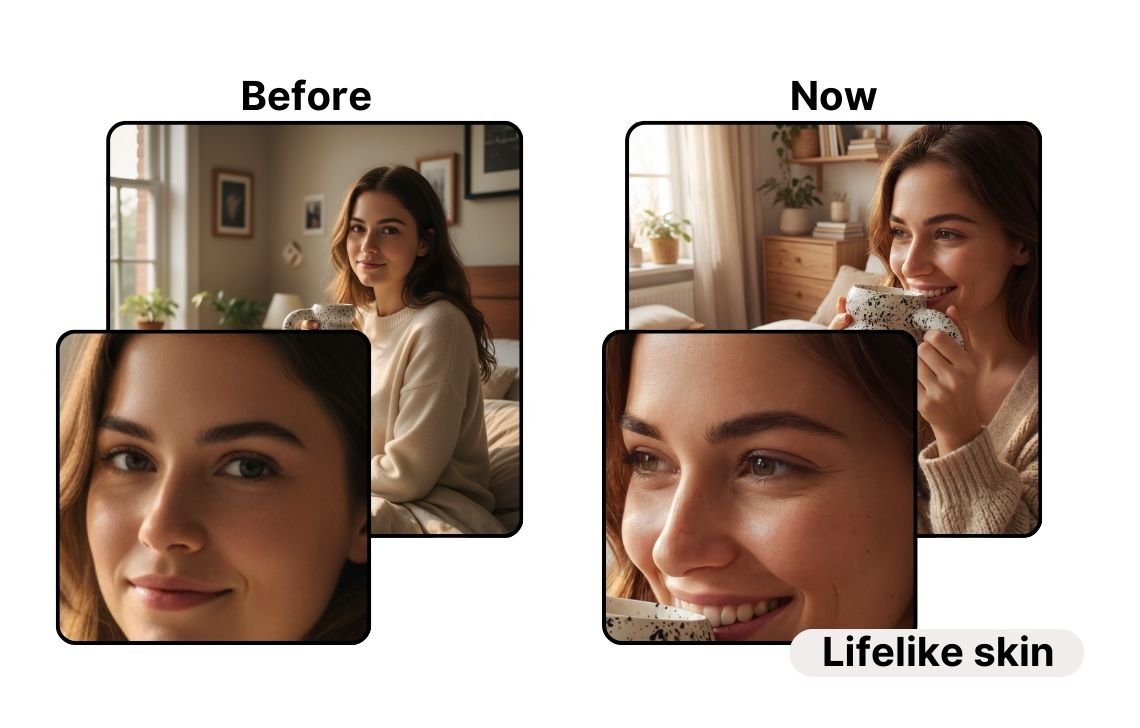 People look more natural, with more convincing skin texture and tonal variation instead of an overly smoothed, “plastic” finish. It’s especially important for lifestyle content where viewers judge realism fast.