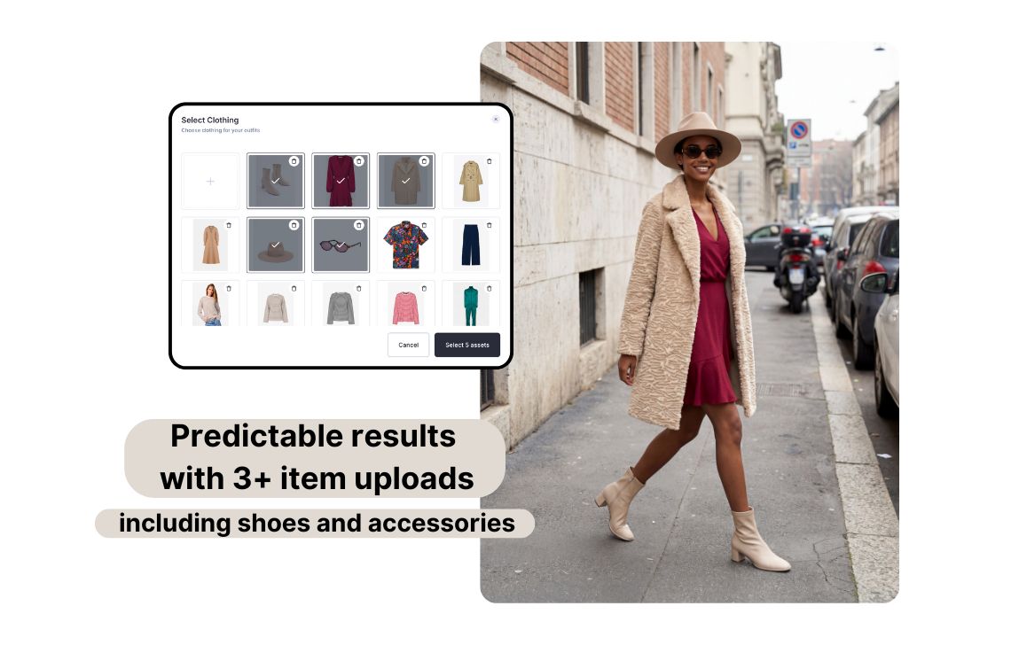 On top of that, AI Fashion Models allow you to add more clothing items (and accessories) without worrying about AI misunderstanding the styling. You get fewer retries, more consistent photos, and faster production of complete, merchandisable looks.