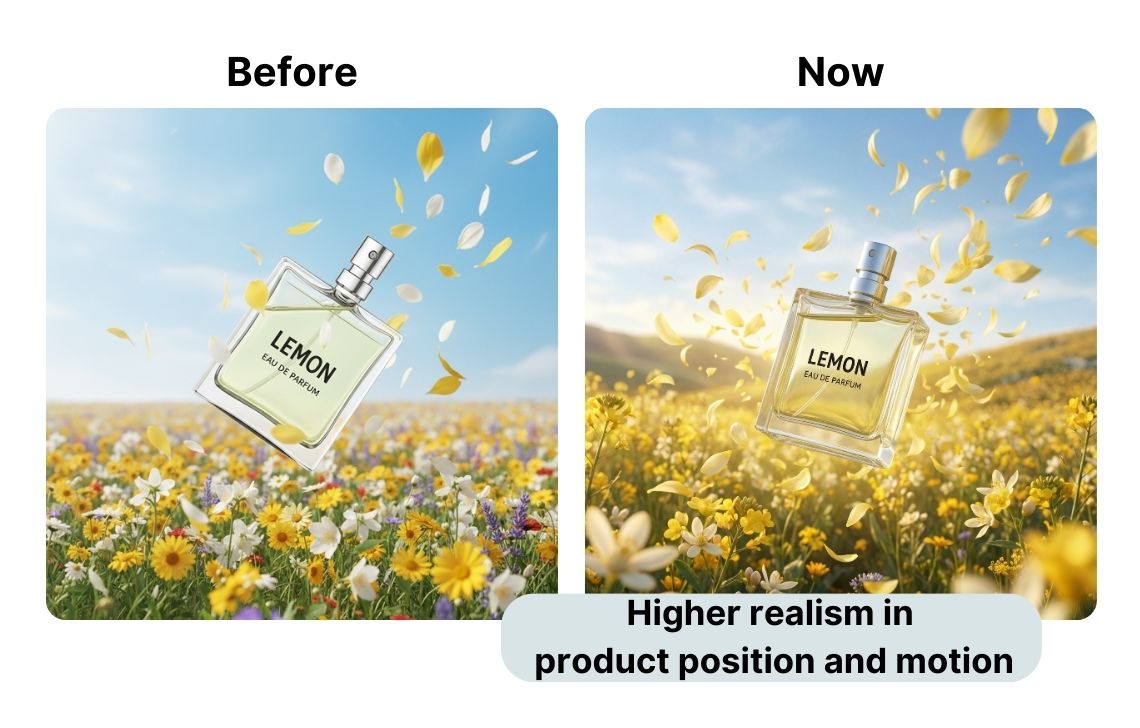 The tools also handle your ideas with higher accuracy. Products sit in the scene with a more believable perspective and “physics.” For instance, floating or dynamic compositions feel intentional and professionally shot.
