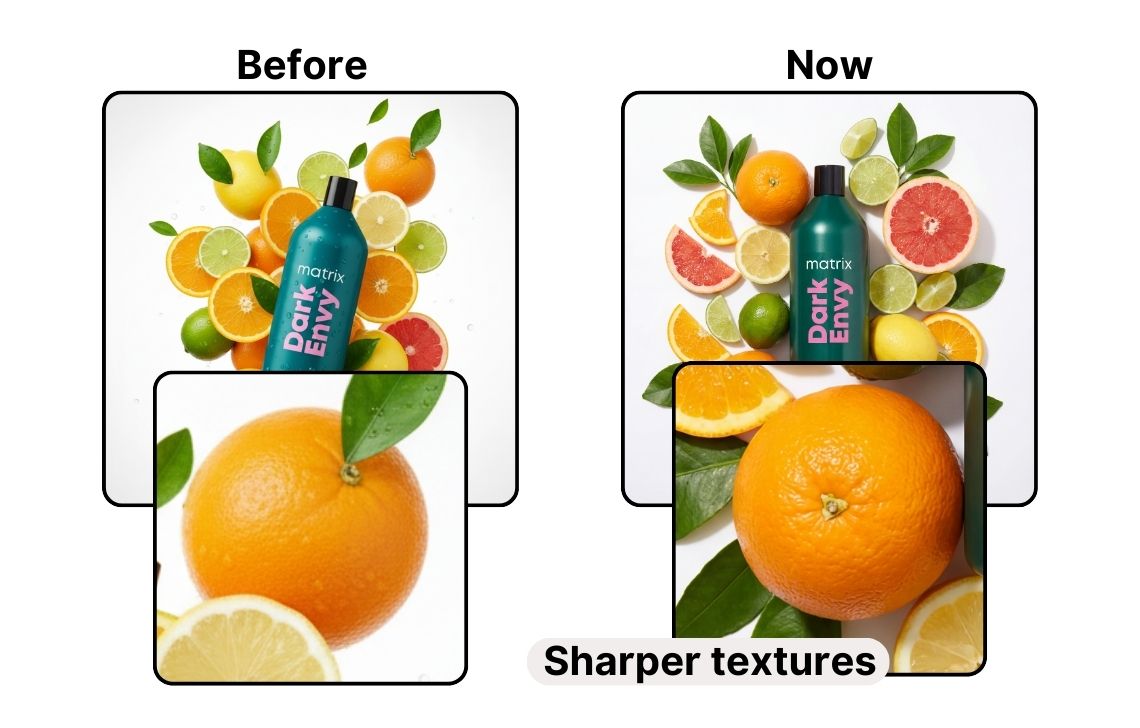 Plasticky skin and smoothed out surfaces are a thing of the past already. The new generation quality preserves fine surface detail (think citrus peel pores, fabric grain, and label edges) so assets look sharp even in close-ups.