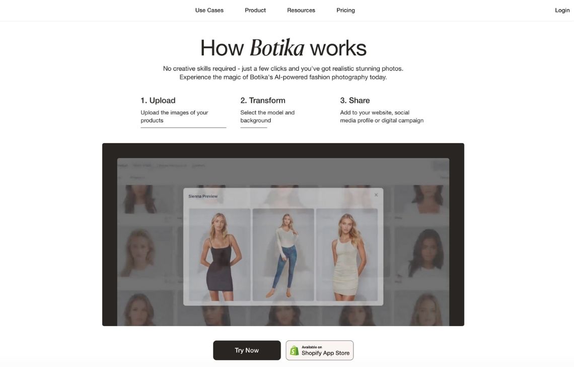 Botika focuses on AI-generated fashion models with a heavy emphasis on Shopify integration. Its pitch is simple: turn basic product photos into photorealistic on-model images and short videos so shoppers can see drape and fit.