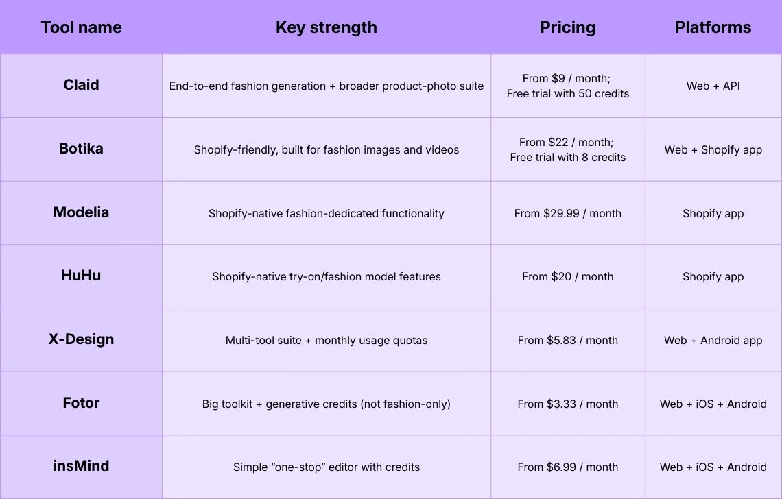 At the higher end, HuHu AI Studio targets large apparel brands and agencies, combining generative AI with a human creative marketplace to deliver thousands of brand-consistent images.