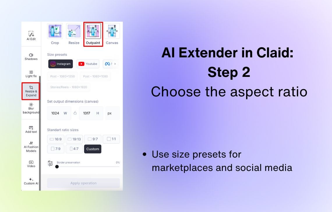 Under Resize & Expand, choose Outpaint. In the left menu, you’ll have plenty of size presents designed for different social media platforms and marketplaces. You can either choose one of those or click on the desired aspect ratio from the list below.