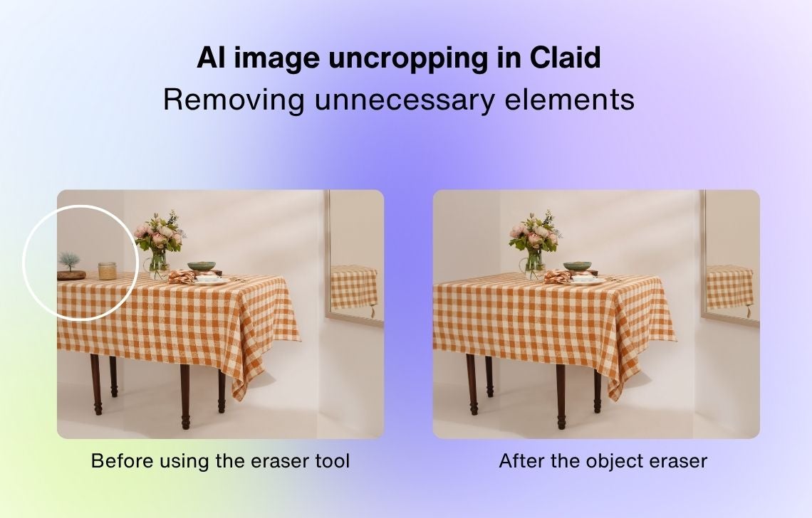 Here’s an example of how AI photo uncrop resulted in extra props, which we removed with Claid’s object remover: