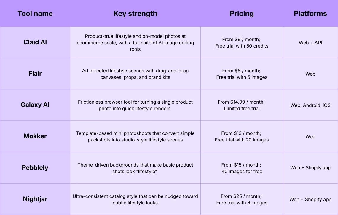 - Can you build reusable styles or templates? Nightjar’s style system, Flair’s templates, and Claid’s compositions all exist to prevent each AI lifestyle photo from looking like a different photoshoot.