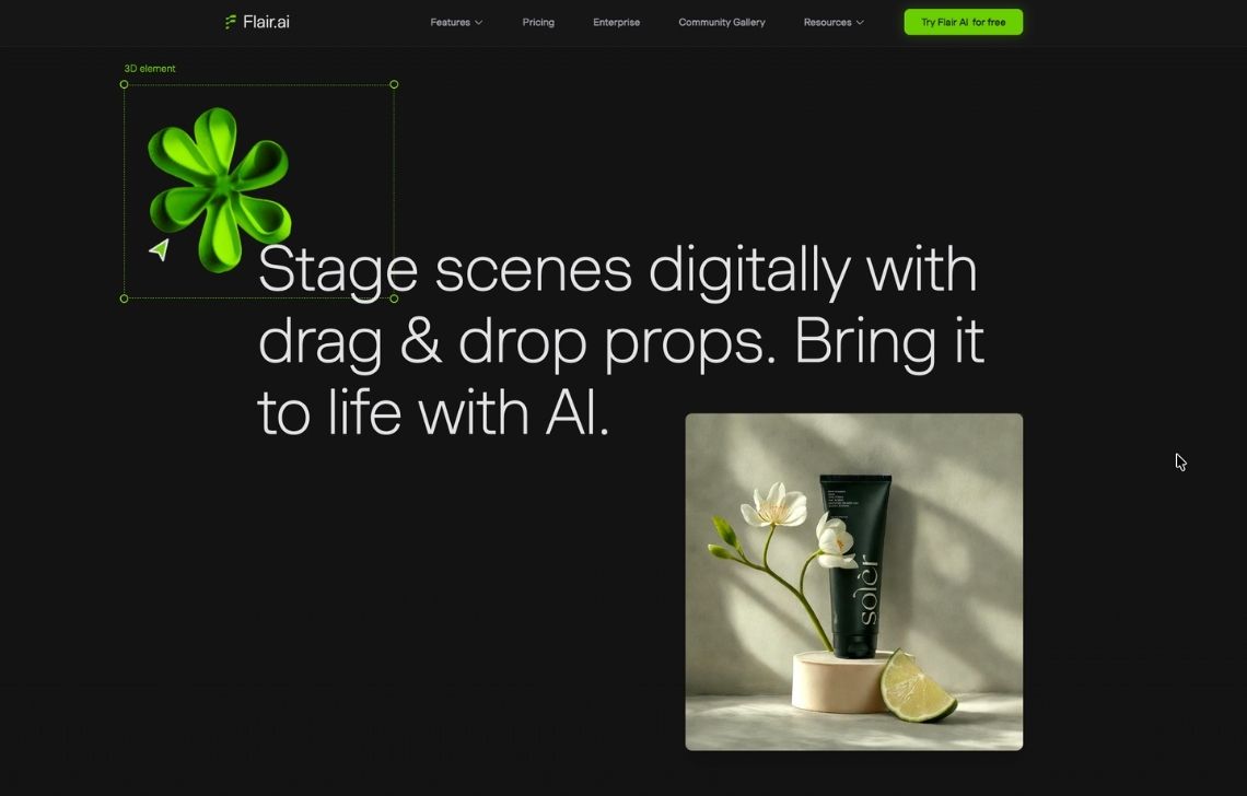 You can build layouts with props, define brand palettes, then let the AI fill in lighting and atmosphere for lifestyle scenes. Flair also offers AI fashion models and basic video generation on higher tiers, which makes it appealing for brand and social teams.