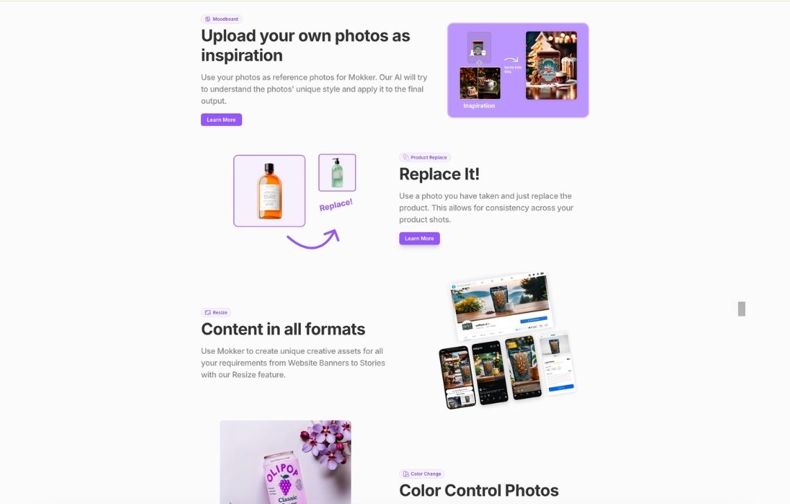 Mokker AI is an AI product photo tool that replaces backgrounds and builds simple lifestyle scenes from a single product shot. You upload 1–3 images of the item, pick from industry-specific templates or adjust your own composition, and let the model remove the background and render a new environment that looks more like a photoshoot than a flat edit.