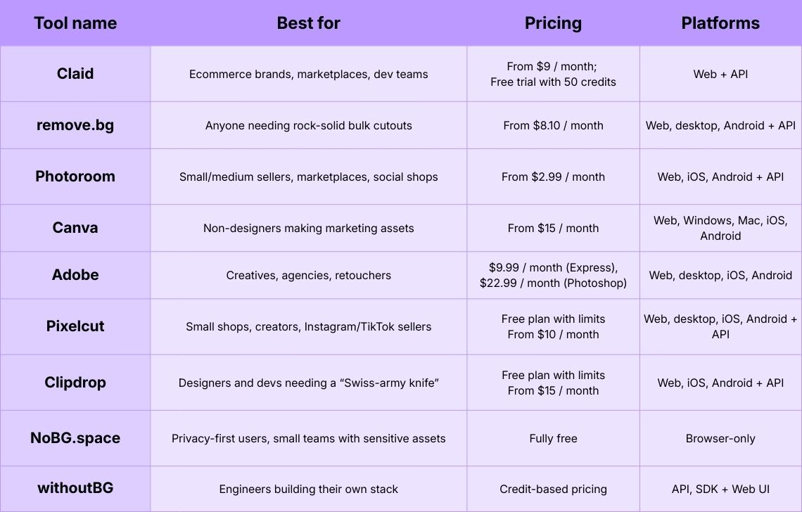 - withoutBG: pick if you want to own the stack: open source, self-hosted, scriptable background removal.