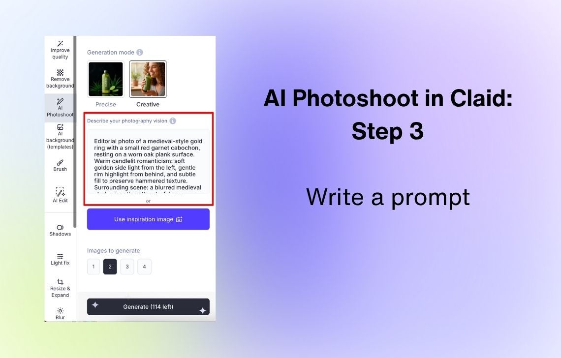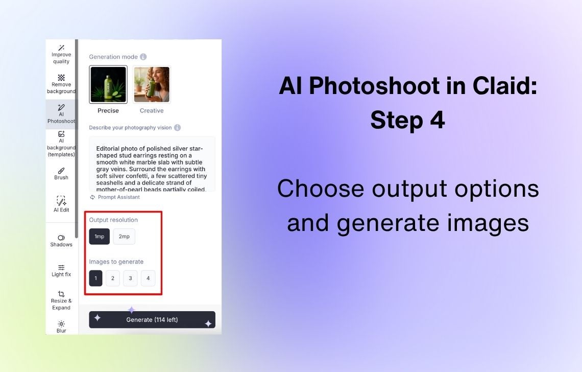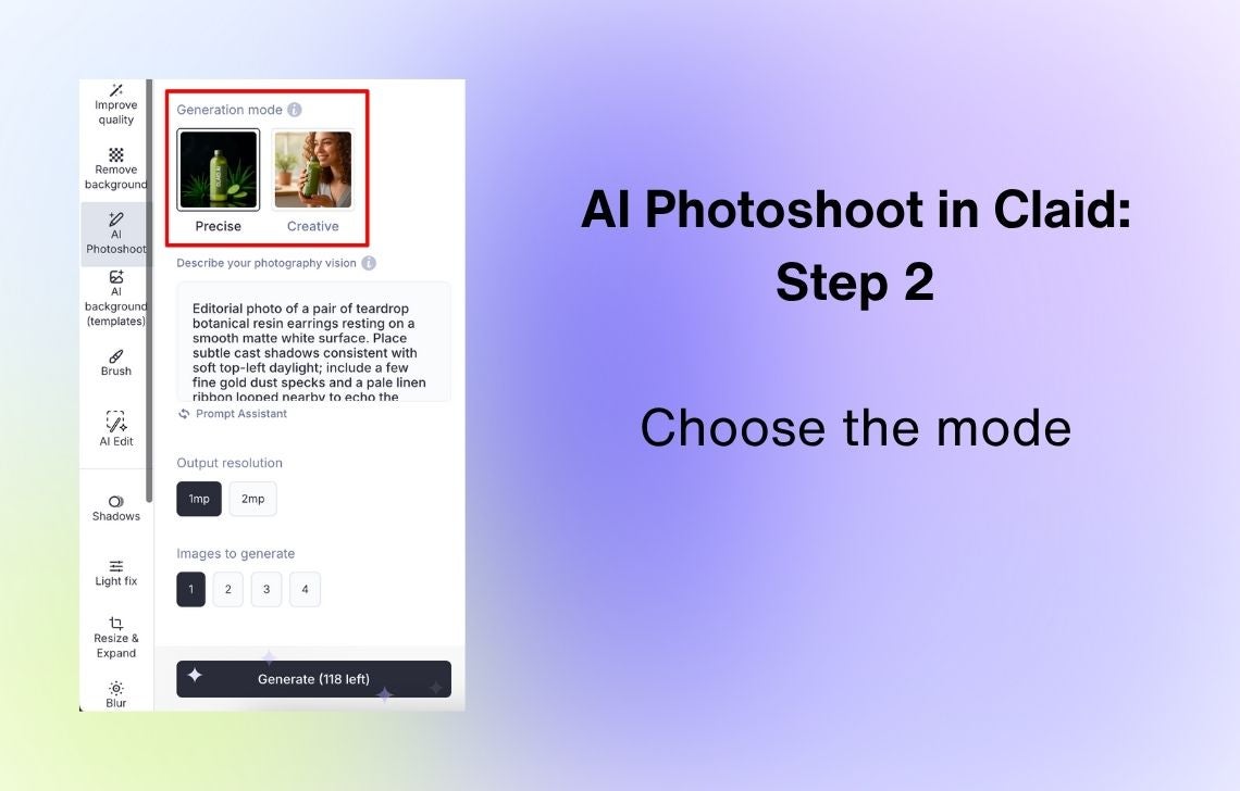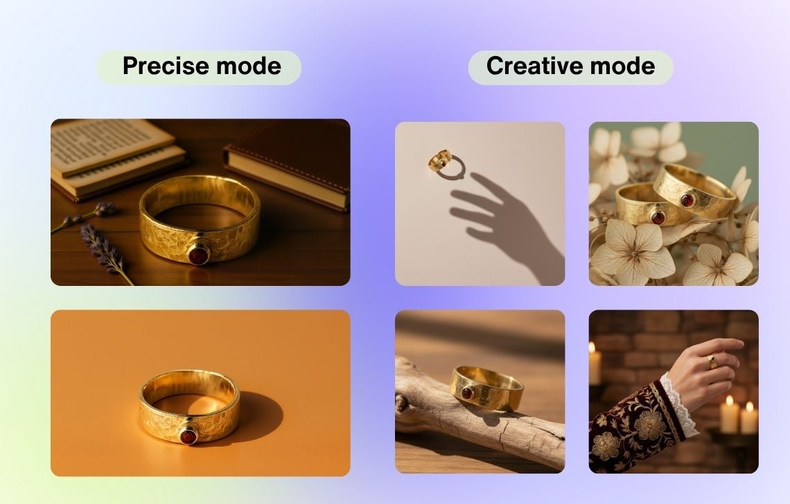 In AI Photoshoot, you can work in Precise or Creative mode.
