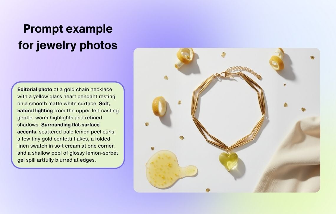 - Mention the style (editorial, luxury, romantic, vintage), lighting type (soft daylight, studio, moody shadows), and composition (flatlay, close-up, model shot).