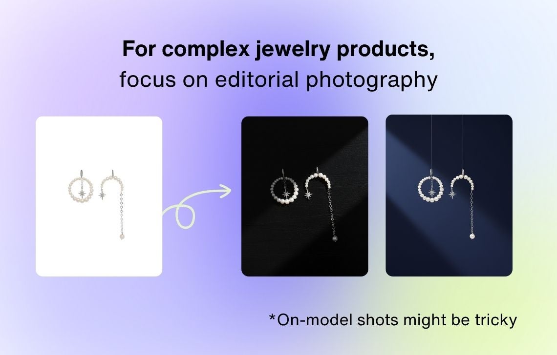 ❗ Be careful with on-model placement. AI algorithms are not yet smart enough to understand complex jewelry, especially how different clasps or earwires work. With AI Photoshoot, focus on creating editorial photos that demonstrate your products from close up.