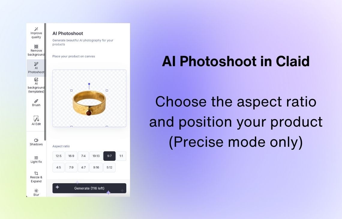 In the Precise mode, you can adjust the position of your product and choose an aspect ratio. While it’s not available in the Creative mode, you’ll be able to resize and outpaint your image with other Claid’s tools.