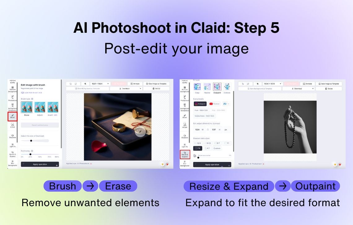 One of the easiest and fastest ways is to use AI tools like Claid. In our editor, you can enhance lighting, remove backgrounds, resize, or expand jewelry photos.