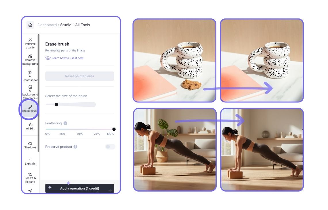 For object removal, you need to choose the Erase Brush and paint over unwanted objects (props, other products, people). The tool will fill the area with realistic background and lighting, reconstructing the scene and preserving the main product.