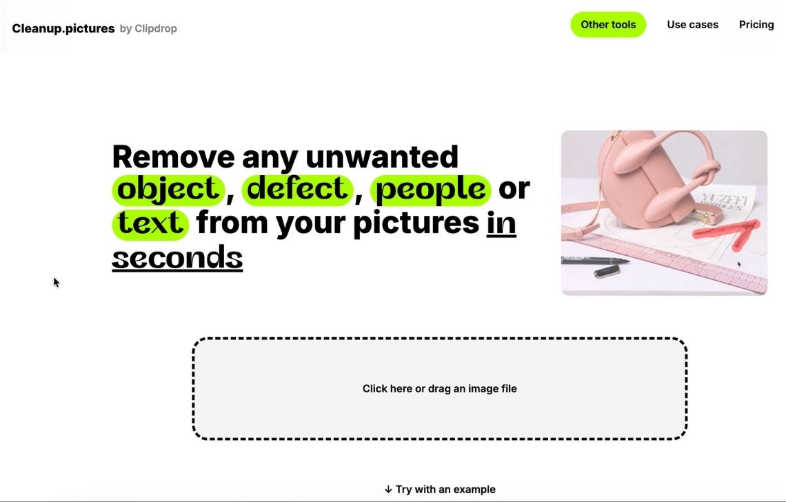 Cleanup.pictures is a simple web-based AI image object removal tool. It focuses on one job: it lets you remove objects, people, text, or defects from photos using AI inpainting.