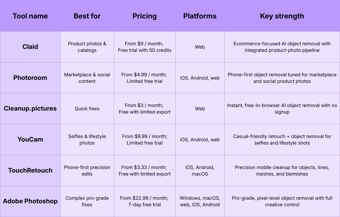 - Claid: best for ecommerce. AI object removal integrated into a full product-photo suite (background removal, AI Photoshoot and AI Fashion Models, outpainting, and other tools), ideal for consistent product images at scale.