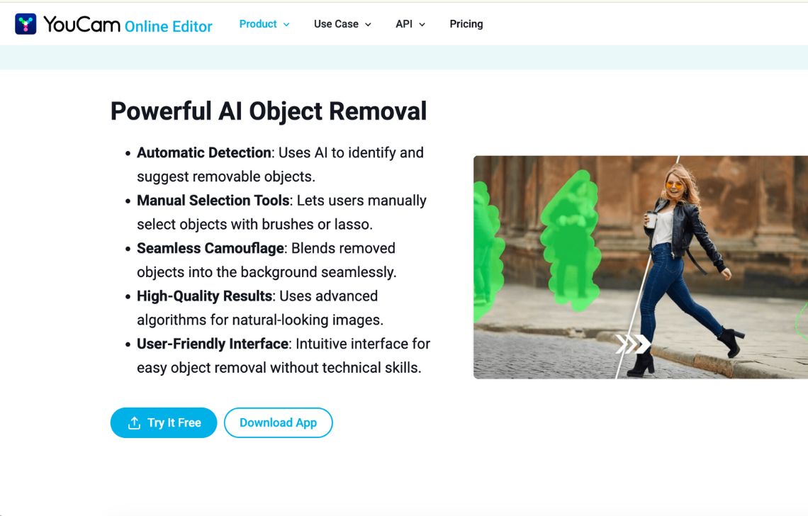 YouCam is a mainstream photo editor that has a strong AI object removal feature focused on lifestyle photos and portraits. The mobile app (YouCam Perfect) and the online editor both let you brush over unwanted people, clutter and text, then rebuild the background automatically.
