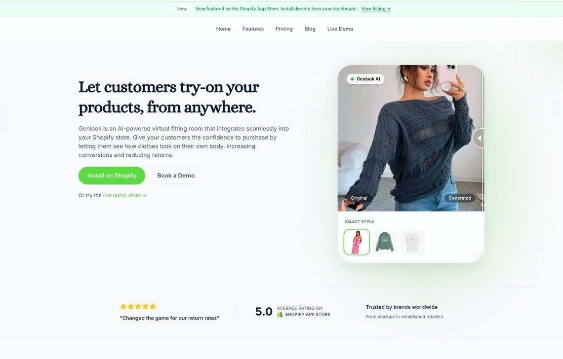 Genlook is another customer-facing option, which you can use for testing conversion impact. It’s an AI virtual try-on tool built mainly for Shopify stores: you add a widget to product pages so shoppers can see clothes “on them,” and you also get additional features like analytics and lead capture.